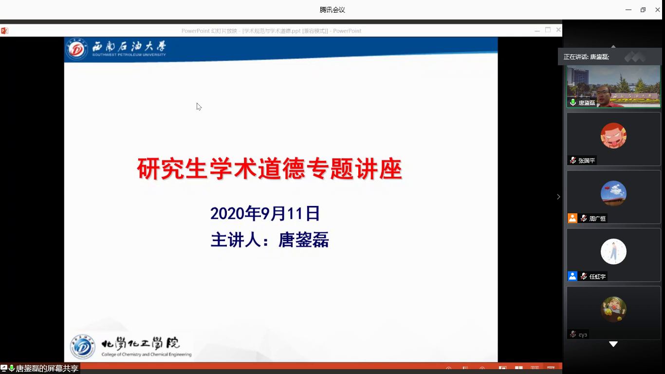 为培养和提高研究生的学术道德意识,坚守学术诚信,完善学术人格,9月11日上午,化工院线上举办2020级研究生新生入学教育——学术道德讲座。本次讲座由化工院研究生辅导员周广恒主持,化工院副院长唐鋆磊担任主讲人。 唐院长以“什么是学术”作为讲座切入点,逐一向大家介绍了剽窃、抄袭、篡改实验数据、伪造、私自署名等违反学术道德规范的行为,希望同学们在今后的科研道路上能够引以为戒,脚踏实地搞科研,勤勤恳恳做学问;接着用一系列学术不端的案例向同学们具体说明了学术造假的严重性,学术造假是违背学术道德和科学精神的表现,也导致了如今的大学科研环境充满浮躁,急功近利;最后呼吁每一位同学,杜绝侥幸心理,反对浮夸浮躁,严守学术道德规范底线,弘扬科研精神。 最后主持人进行总结,提醒我们每一位学子要注重科研精神,重视学术道德与规范,坚决抵制学术不端行为,共同营造良好、健康的科研氛围。(文/张国平 图/刘敏)