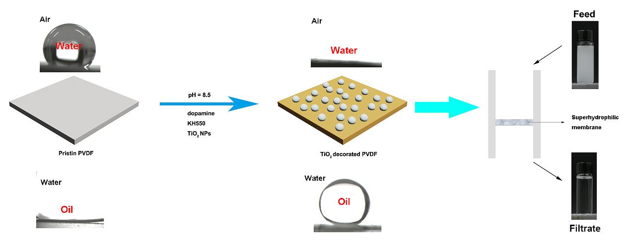 目前,具备特殊润湿性(超亲水、超疏水)材料用于油水分离的研究成为一大热点,相较于传统的油水分离材料,这些具有特殊润湿性能的材料拥有更高的分离效率以及重复利用的能力。其中,对传统的高分子分离膜的改性使其获得特殊的润湿性在近几年也备受瞩目。我院油气田腐蚀创新团队课题组研究生石恒通过近一年的潜心研究,通过大量实验探索,在该领域取得了一定进展,通过一种简单的方法,在普通的聚偏氟乙烯(PVDF)膜表面接枝亲水的纳米TiO2颗粒,并同时进行一种特殊的亲水改性,制备了一种新型的超亲水-水下超疏油的PVDF膜,所制得的膜能有效分离各种乳化剂乳化的油水乳状液并且具有较高的抗污染性能。此外,所提出的方法也适用于其他无机-有机复合体系的制备,具有广泛的普适性。 石恒同学的以上研究结果发表在Welly出版的膜方向的权威期刊Journal of Membrane Science 上(影响因子5.1;中科院SCI期刊分区 1区;标题 “A modified mussel-inspired method to fabricate TiO2 decorated superhydrophilic PVDF membrane for oil/water separation”,DOI:10.1016/j.memsci.2016.01.053),该研究生石恒为第一作者,我院为第一作者单位和通讯单位,其指导教师为何毅。