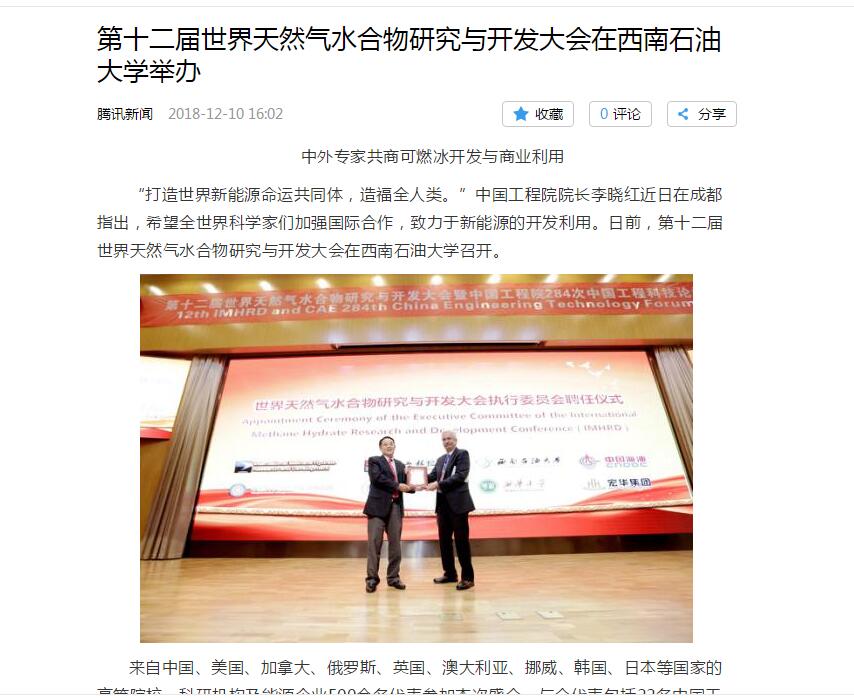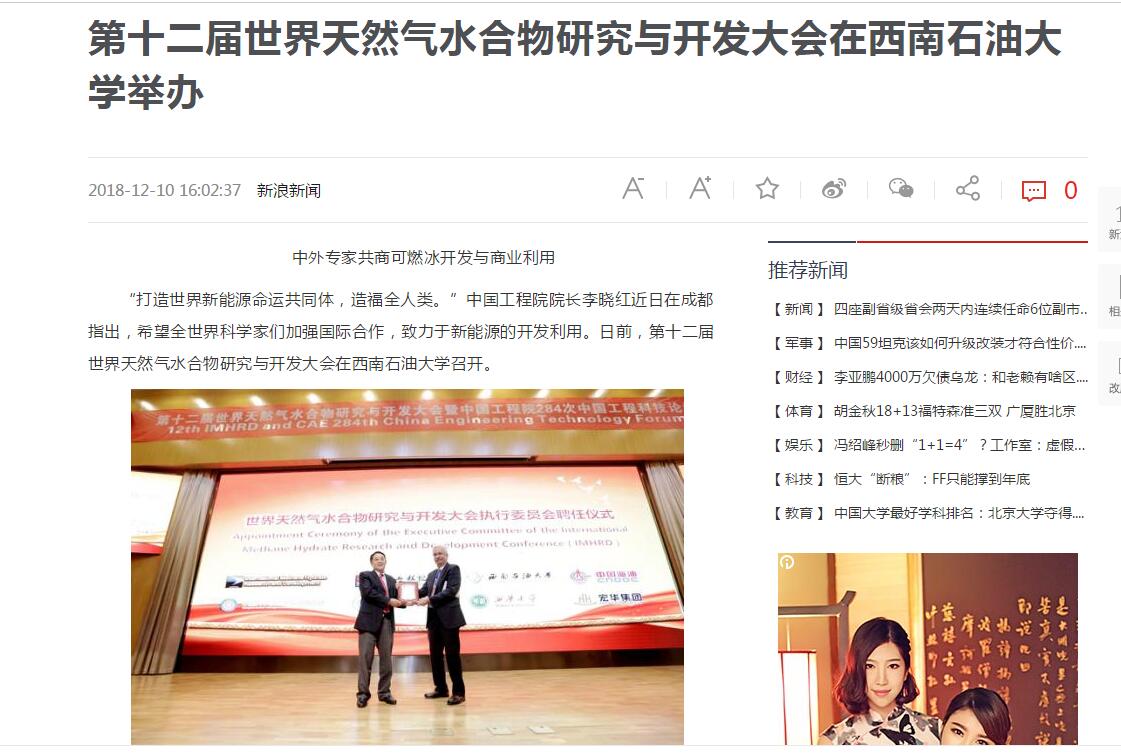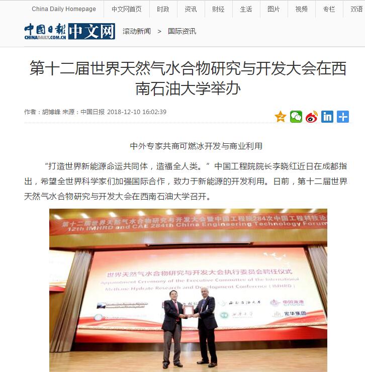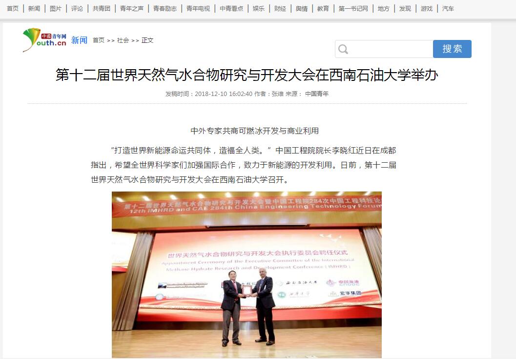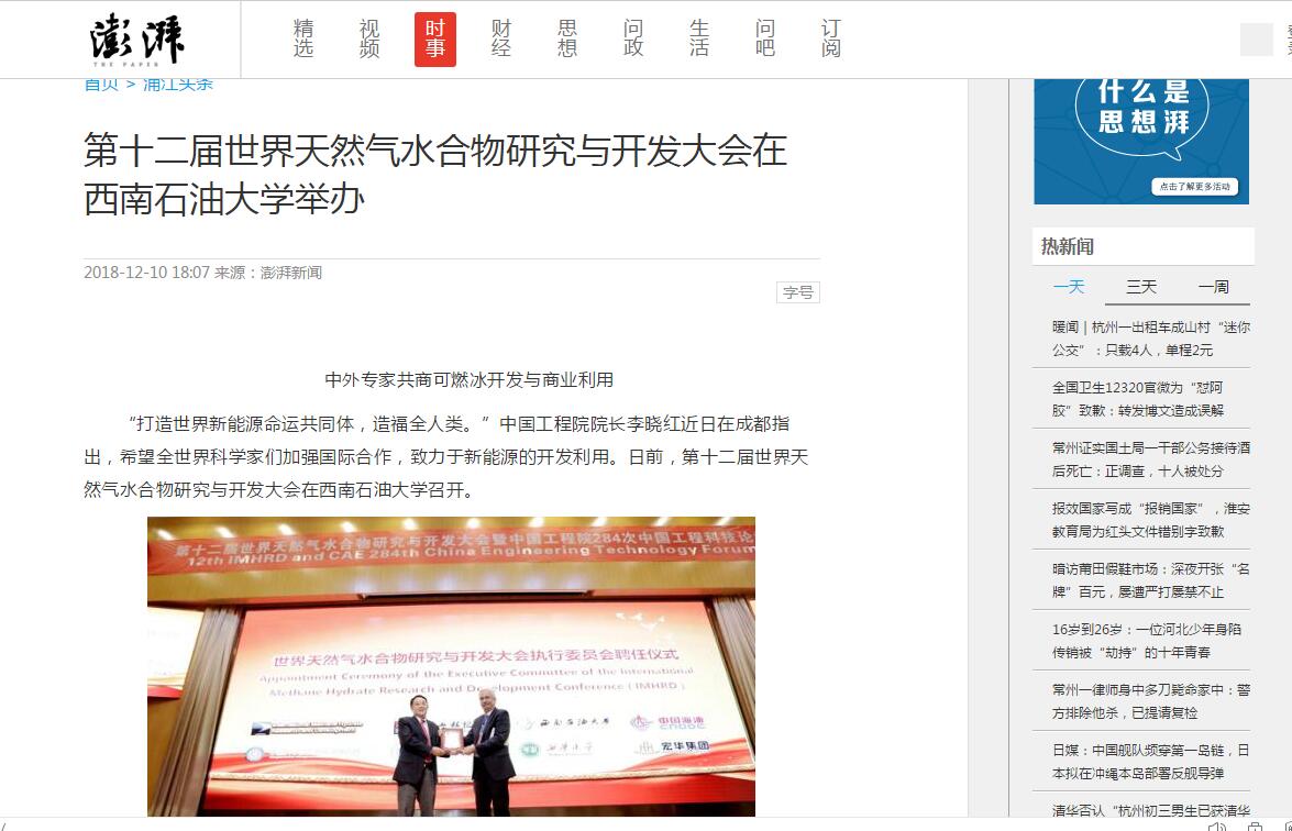 12月10日,澎湃新闻、中国日报、新浪、腾讯、中国青年网等五家媒体以《第十二届世界天然气水合物研究与开发大会在西南石油大学举办》为题,集中报道了我校举行的第十二届世界天然气水合物研究与开发大会暨中国工程院中国工程科技论坛。