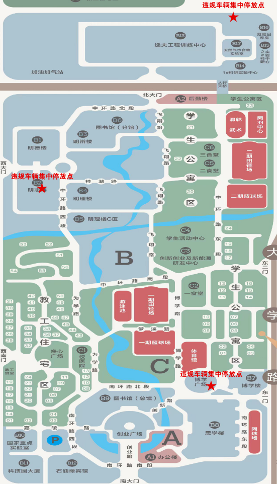 一、2024年5月6日起:学校各大门和校内将实行严格管控,违规车辆将禁止入校,校内行驶或停放的违规车辆,将统一放至违规车辆集中停放点(根据违规车辆停放地“就近”集中停放,具体见附图)。车主将在登记信息、签定承诺书后领取车辆,然后立即驶出校园。已上校内通行标示牌的车辆、非机动车按照《西南石油大学校园交通管理办法(2024年修订)》进行依法依规管理,将对超速、违规搭乘、乱停乱放等违规行为进行集中整治。