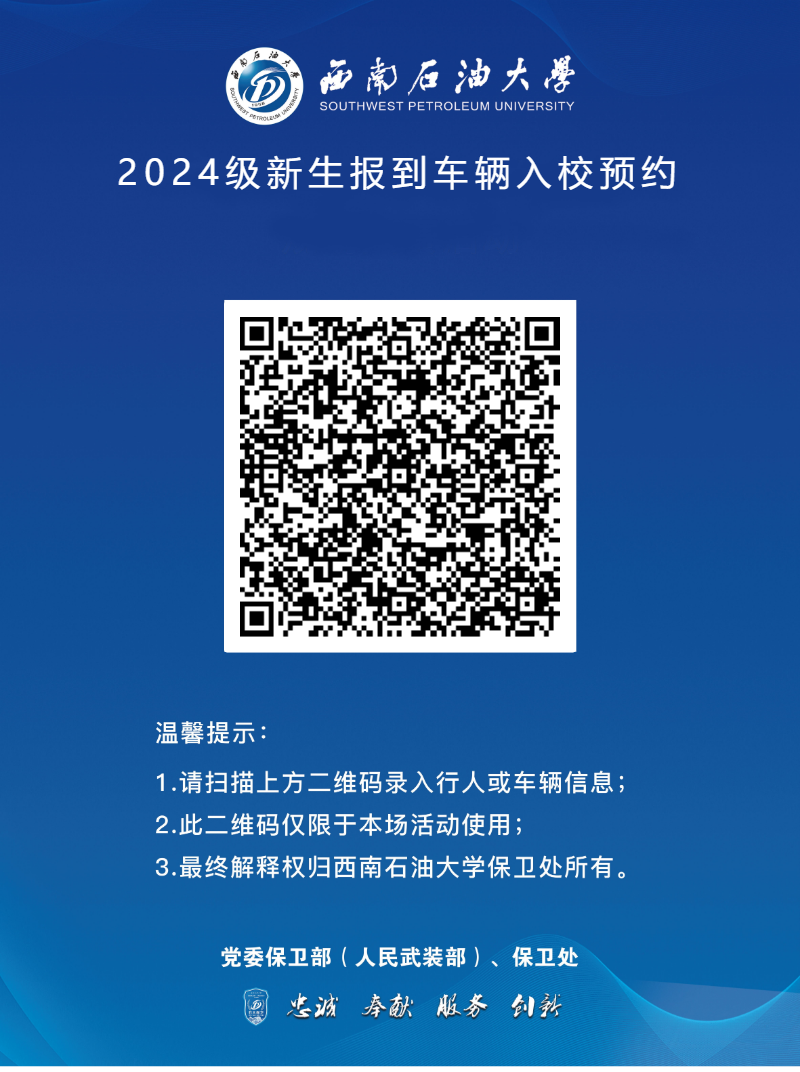 三、驾车前来的新生及家长朋友们,需提前在网上进行自主申请(可微信扫描“2024级新生报到车辆入校预约”二维码(见附图)申请,根据自身情况选择合适的入校时段,为给更多新生及家长提供便利,原则上每名新生仅能为一辆送行入校车辆选择一个时段进行预约,每辆车在报到期间仅能预约一次),经同意后,相关车辆可按预约时段从西大门(百度地图搜索“西南石油大学(成都校区)-西门”)入校(未预约或者不在预约时段内的车辆无法进入学校)。