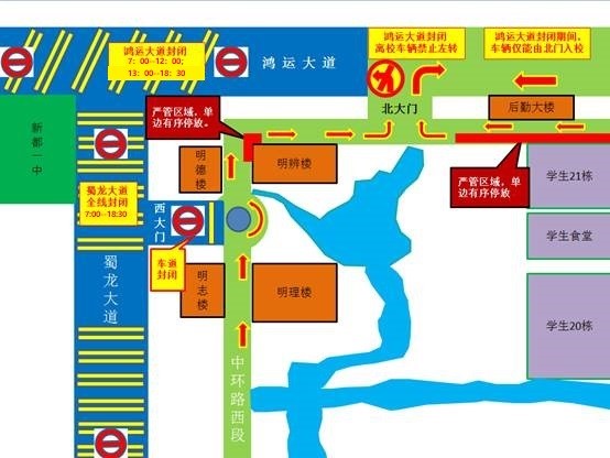 接新都区大学中专招生委员会通知:2025年新都区高考适应性测试将于1月3日至1月5日在新都一中(校西大门外)考点进行。为给广大考生创造一个安全、畅通、安静、有序的考试环境,交警部门届时将对新都一中周边进行较大范围的交通管制。同时,要求我校在测试期间关闭学校西大门机动车通道,以配合相关区域交通管制工作。