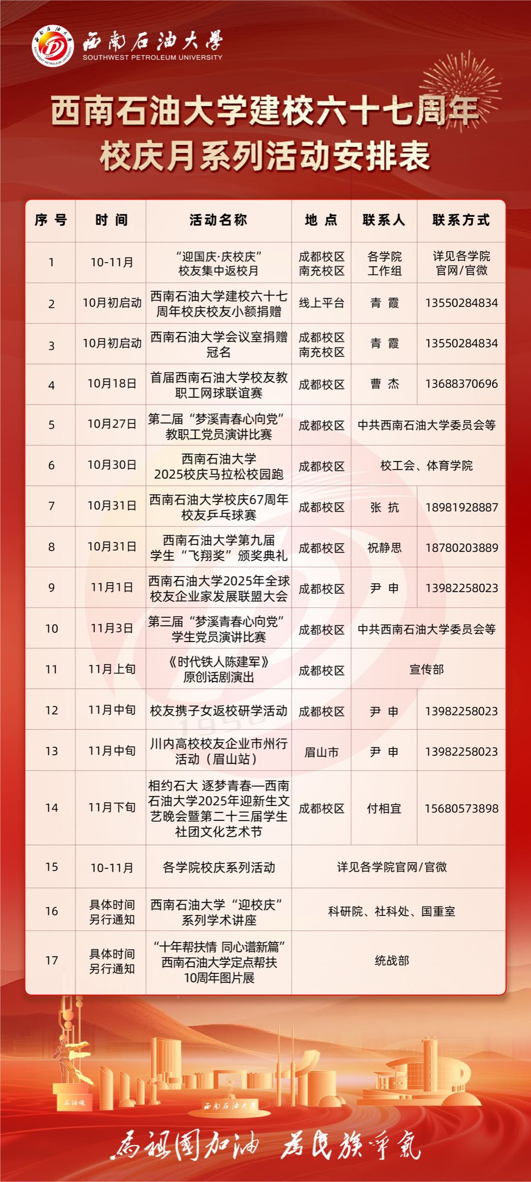 为迎接学校更名后第三次党代会的胜利召开,弘扬传承“为祖国加油,为民族争气”的西南石大精神,集中展现学校六十七年办学成果,凝聚奋进力量,经研究,决定举办西南石油大学建校六十七周年校庆月系列活动,现就有关事项通知如下:
