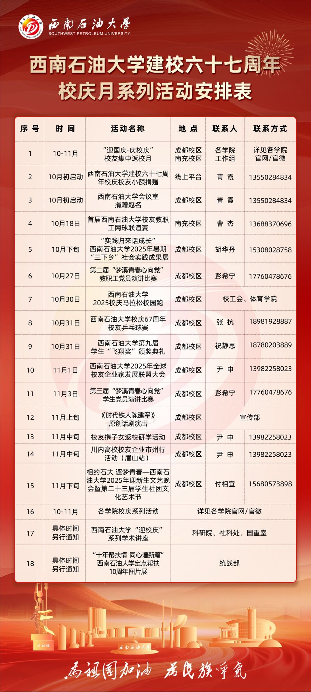 详见西南石油大学建校六十七周年校庆月系列活动安排表,具体活动通知将通过西南石油大学新闻网和西南石大校友微信公众号等官方媒体相继发布。