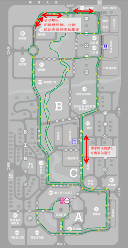 1.管制期间,校园部分干道实行禁行(见附图所示),所有机动车、非机动车、行人将禁止进入管制路段。南大门、西大门、北大门入校车辆与行人在参赛队伍通过期间或人流量较大时段禁止通行;博学路西侧干道实行交通管制,禁止通行;博学路东侧干道实行单边双向通行。