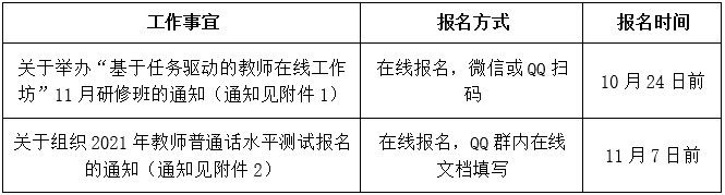 为保障教师在线工作坊研修、教师普通话水平测试工作的顺利开展,现将10月教师教学发展相关工作做如下安排(具体通知见附件):