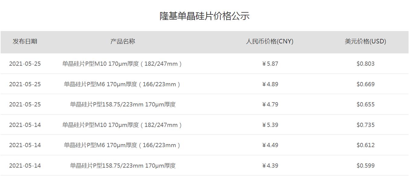 5月25日,隆基股份公布6月硅片价格,M10、M6、G1全面上涨。其中M10由5.39元/片上涨至5.87元/片,涨价0.48元/片;M6硅片由4.49元/片上涨至4.89元/片,涨价0.4元/片;G1硅片由4.39元/片上涨至4.79元/片,涨价0.4元/片。