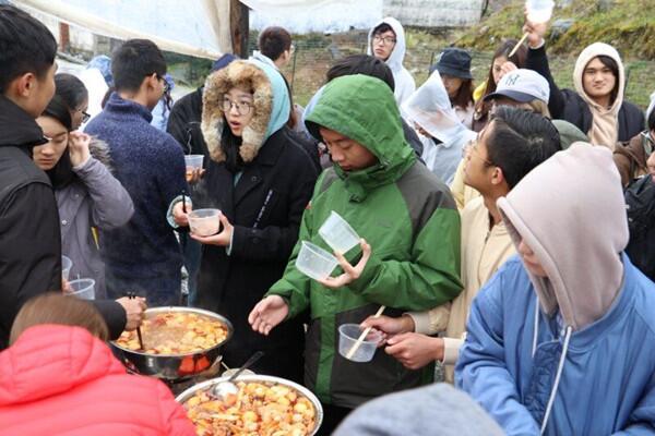 抵达冶勒湖后,因为大巴车只能抵达门口,所以同学们只能徒步一段距离,由领队带领大家前往营地安营扎寨,在此途中同学们都乖乖的听着领队的指挥:不靠近湖泊悬崖边缘!搭建好帐篷后,同学们开始了尽情的玩耍!等到17:00左右同学们回到了营地开始准备晚餐,同学们切菜的切菜,烧水的烧水,烫着火锅唱着歌一起度过一个美好的夜晚。