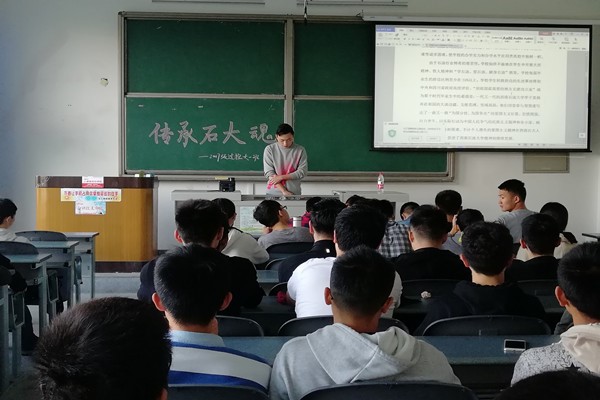 大一班成员在周翔宇主持人的讲解下详细了解了西南石油大学精神发展史:首先是孕育发展期。从西南石油大学从建校到成都校区建立前的一段历史。让大一班的成员们了解了西南石油大学最早一辈先人“为国分忧,为国争光”的传统美德。随后在形成升华期,即2000年西南石油大学建立成都校区到2004年间。我校秉承了先辈的优良传统,确定了“为祖国加油,为民族争气”为“西南石大精神”。