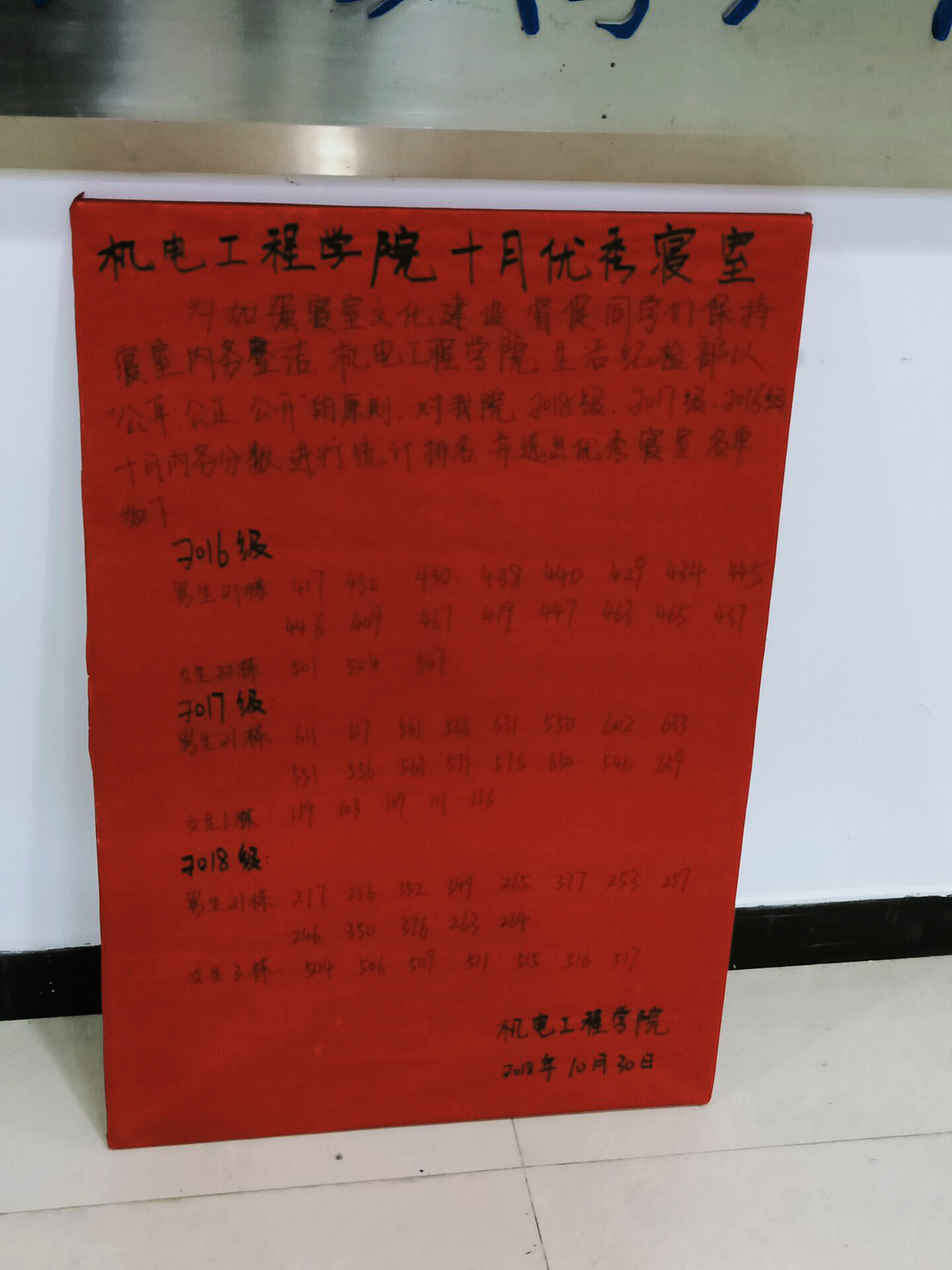 2018年10月30日十月优秀寝室名单公布。每月寝室评比并选出优秀寝室旨在加强大学生寝室文化建设,使同学们注重寝室的整理。