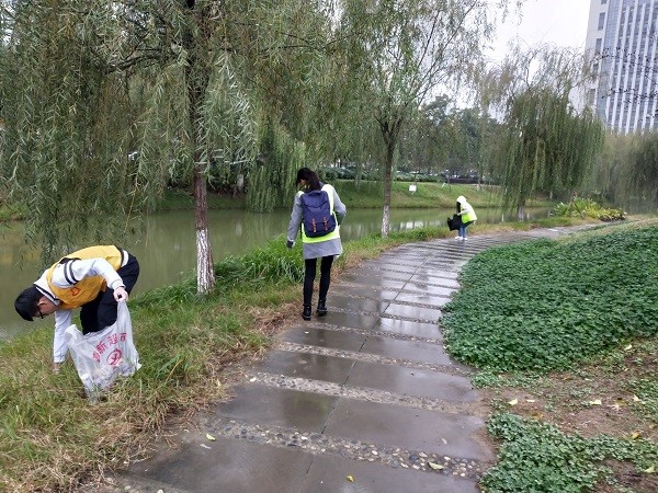 活动开始前,负责人便早早地来到1期篮球场外等候志愿者们,组织签到及对大家进行活动分工。活动开始后,志愿者们兵分两路,沿着梦溪湖畔进行清扫。活动过程中,志愿者们戴着手套,弯腰从草丛中捡起那一片片刺目的白色垃圾。尽管天公不作美,不一会儿天空下起了料峭寒雨,但是这并没有浇灭志愿者们的热情,反而他们撑起自己的雨伞或戴着帽子在自己负责的区域内辛勤地工作着。终于功夫不负苦心人,通过志愿者的共同努力,林间小道、草坪深处均已不见塑料袋、烟头纸屑。志愿者们用自己的一份努力为学校增添了一抹明亮,让清幽宁静的梦溪湖变得更加美丽。