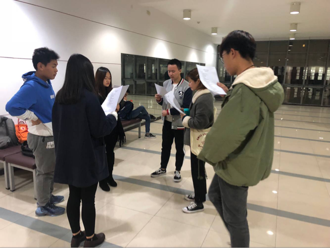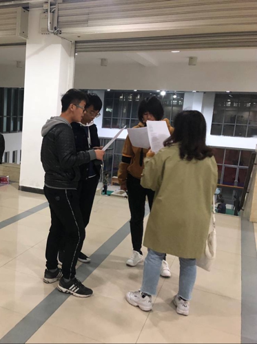 寒风吹细雨,这冰冷的夜冻不了我们的热情。今晚八点四十,在明志楼的大厅,部长们陪同演员们一起积极准备团会表演。