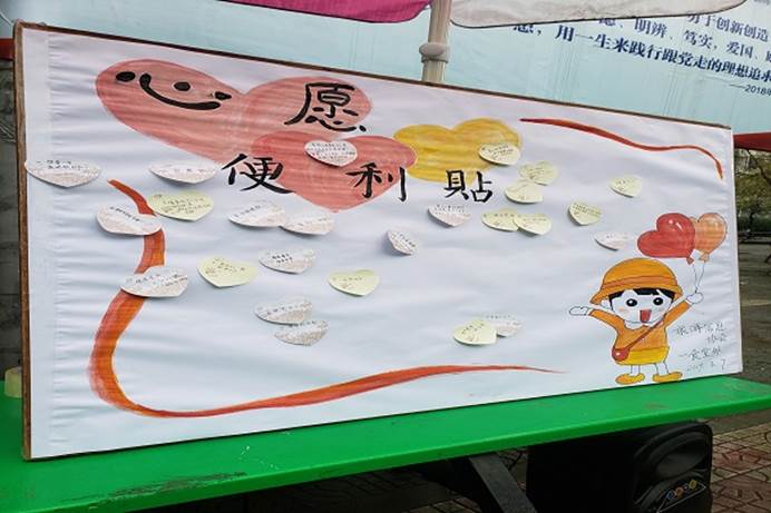 女生们先在准备好的便利贴上写上愿望,然后写上序号,然后再登记自己的姓名和联系方式,慢慢等待愿望被某个幸运男生撕下来了。随着女生们一张张贴上自己的愿望,男生们也来撕下这些中的愿望帮助她们实现。