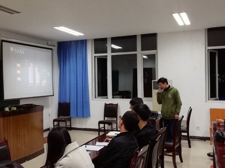 稍后由机自陈加豪班长介绍班级四六级、计算机的过级情况与寝室卫生状况,目前班级CET4过级