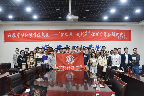 3月29日晚7点,由机电院研会生活部主办、西南石油大学社团联合会协办的“礼敬中华传统文化——你选书,我买单”读书分享会颁奖晚会在明志楼B504举行。活动邀请了机电院本科2017级辅导员母小琳,机电院研会主席张文远、邱勇智作为嘉宾出席活动。