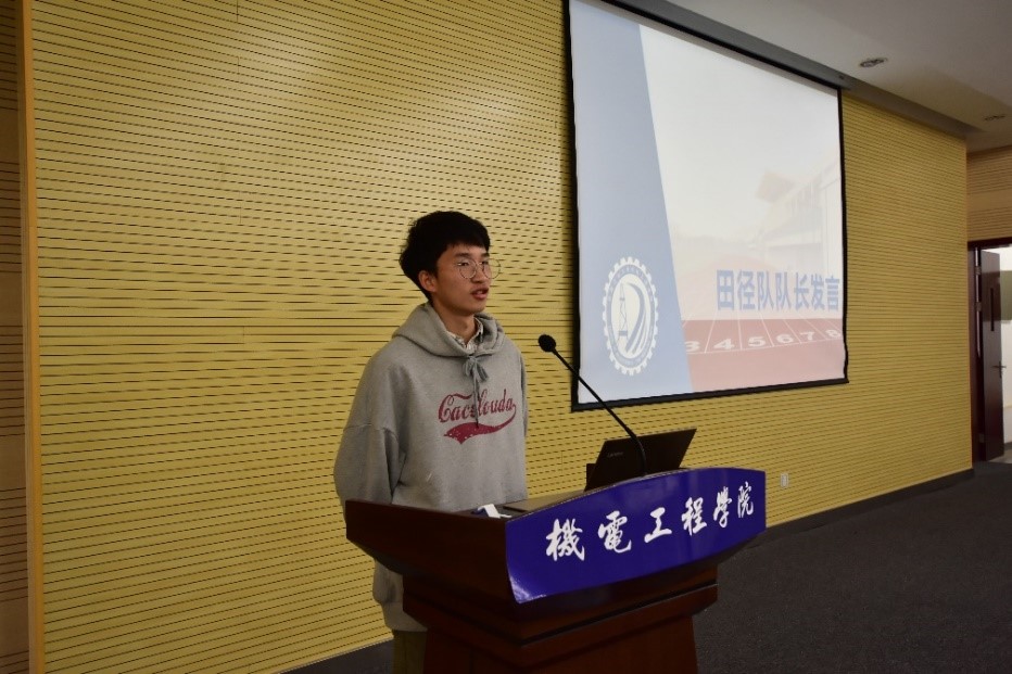 大会第二项由机电院田径队队长肖扬同学发言。肖同学先是感谢了机电院对运动员们的栽培与支持,肯定了田径队队员们长达半年的长期训练成果,并表示今年也将带领运动员们发扬我院“不服输争第一”的精神,在赛场上全力拼搏。