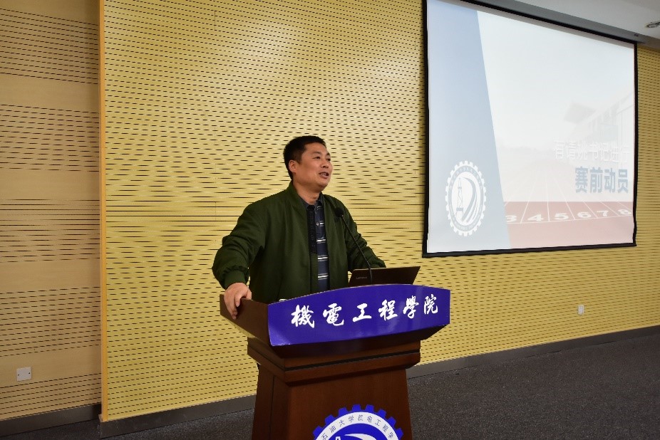 会议第一项由姚伟宁老师上台讲话。姚书记首先简要回顾了机电院往届运动会的成绩,肯定了运动员们平日里的付出与汗水,对运动员们的积极参与表达了感谢,并对运动员们提出了要求:希望运动员们都能拿出机电院“不服输争第一” 的拼搏精神,在赛场上记住自己代表着机电院的荣誉。讲话中姚书记还说到:“除了第一线的赛场,运动会的成功也离不开后勤学生会人员的付出,希望学生会的同学们能在自己的岗位认真工作,做好后勤保障。”