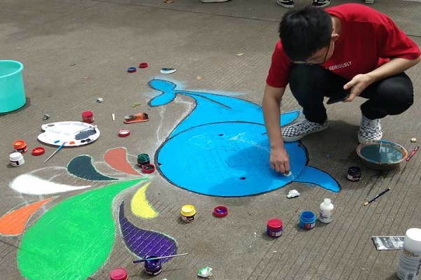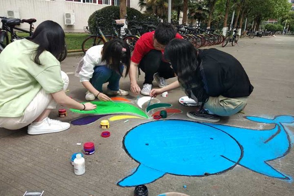 早上9.00,刘芳铭会长带着材料先到达思学楼附近指定地点,随后几个理事也到场,由于对绘画流程的不熟练,第一次在井盖上作画失败了,在重新构思后,开始了第二次作画。准备绘画出一条鲸鱼,勾勒图案,填充颜色,对各环节一丝不苟,终于在几人的共同努力之下,井盖“消失”了,取而代之的是一条灵动的鲸鱼。看着辛苦几个小时的成果,每人脸上都是抑制不住的喜悦。