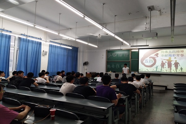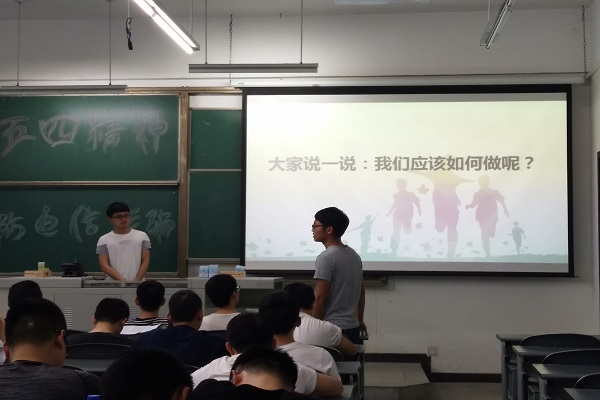 班会由班长何胤主持,由团支书胡学华向同学们解释五四精神,大家在团支书的带领全体起立齐唱中国共青团团歌,踊跃回答我们应该如何回答五四精神。随后,学习委员陈印为大家讲解防电信诈骗,陈印同学还通过自己的一次切身经历向大家展示骗子如何利用受害者的心理骗取手机,同学们也开展了积极的讨论,受益良多。其后,生活委员郑继禹解释班费开支,并表扬了这一学年以来所有积极参加各项体育运动的同学,鼓励大家积极参加活动。最后由班长再次向同学们说明日常生活、学习中大家需要注意的问题,包括寝室用电安全、假期离校问题、四六级、体育活动等。
