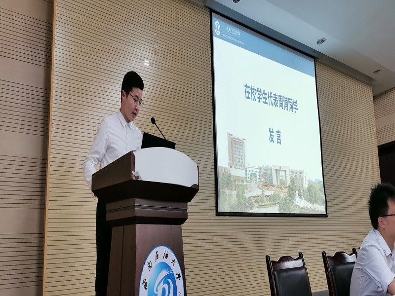 随后,2018级研究生会主席周博同学发言,他表示新起点,新征程,我们是新时代发展的核心动力;遵循严谨求实、创新进取的学风;同时2019级新生代表左润东同学提出牢记明德笃志,博学创新的石大校训,积极进取,与时代共进,为祖国腾飞拼搏奋进。