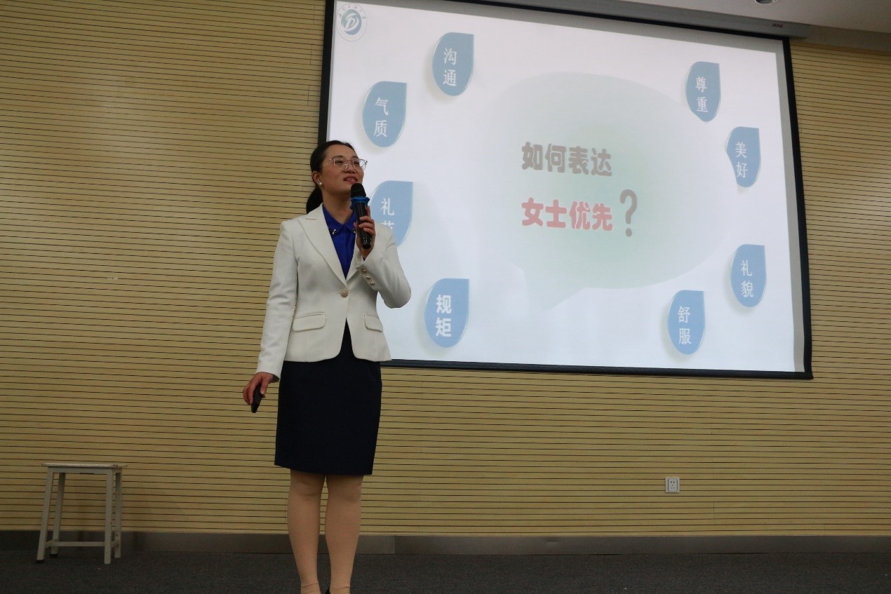 讲座拨正大家对“女士优先”的理解,女士优先不是指遇到事情女生先上,而是指女生具有优先选择权。这是社会对女性的礼仪,女生回待他人也需要付之于礼仪。礼仪是在人际交往中,以一定的、约定俗成的程序方式来表现的律己敬人的过程,涉及穿着、交往、沟通、情商等内容。