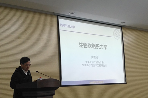 报告伊始,祝效华院长向大家隆重地介绍了冯西桥教授,对冯教授来西南石油大学作学术报告表达了热烈的欢迎。冯教授的报告内容主要分为引言、组织生长的力-生-化耦合理论、软材料失稳分析方法、生物软组织表面失稳、细胞群体震荡、细胞群体运动、结论七个方面。冯教授首先通过引言来让大家了解了他的研究方向和对生物力学研究的体会,引起了同学们对生物力学研究的兴趣。然后以癌细胞的生长和扩散为例,通过实验图片和视频的方式解释了组织生长所需要的条件,并对细胞失稳机理做出了解释,主要影响因素有几何构型,本构关系、外加载荷。