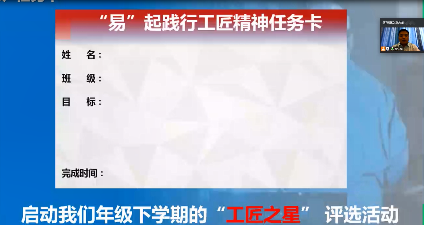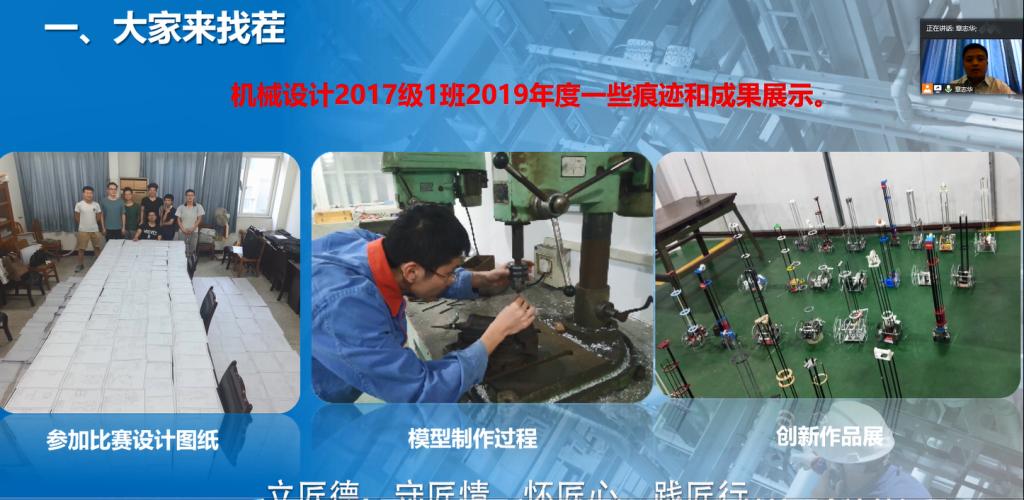 为了进一步弘扬工匠精神,锤炼学生高尚的职业道德和扎实的职业技能,引导学生养成热爱专业、热爱学习、提高技能的好习惯。机电院2018级线上召开以“读懂工匠精神 助推梦想旅程”为主题的班会。