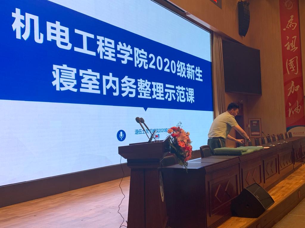 退伍士兵张文博为2020级新生带来了寝室内务整理示范,从寝室卫生、被子整理到自身行为规范,都一一讲解,并亲自展示了叠被子技巧,现场师生都热情洋溢。但纸上得来终觉浅,绝知此事要躬行。兵哥哥娴熟的展示新生们都铭记于脑海,但他们更决心要在日常生活中,将这一份执着与认真延伸下去,寝室内务是小,但是一屋不扫何以扫天下,机电学子定会以做好寝室内务为起点,走上将每件事都做好的道