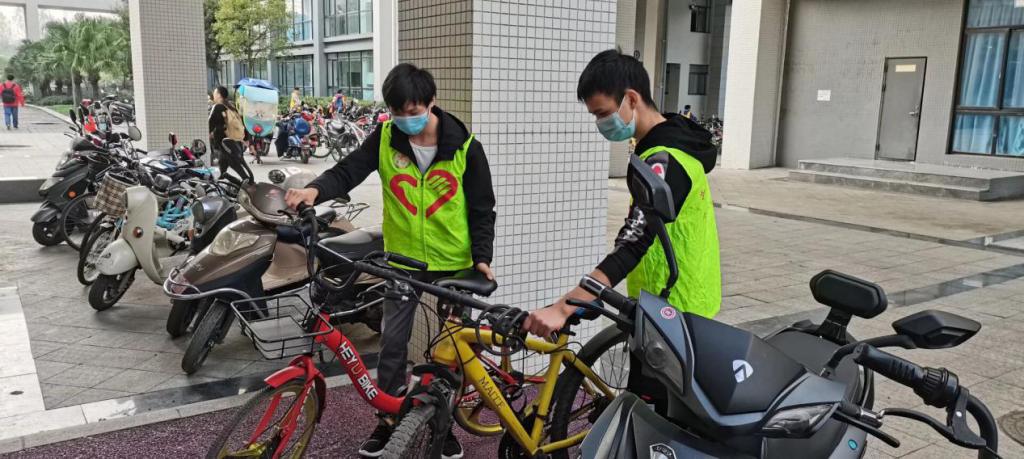 图2 志愿者在22栋宿舍楼前摆放自行车