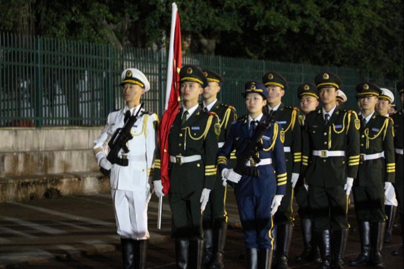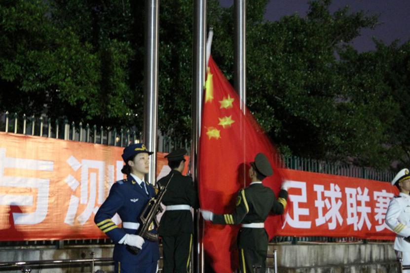 在全体师生的注目礼下,英姿飒爽的国旗护卫队队员们护送鲜艳的五星红旗进场,行礼完毕,伴随着庄严的中华人民共和国国歌,五星红旗冉冉升起,迎风飘扬,在场的每一个人向国旗行注目礼,深怀对祖国无限的热爱和崇高的敬意。