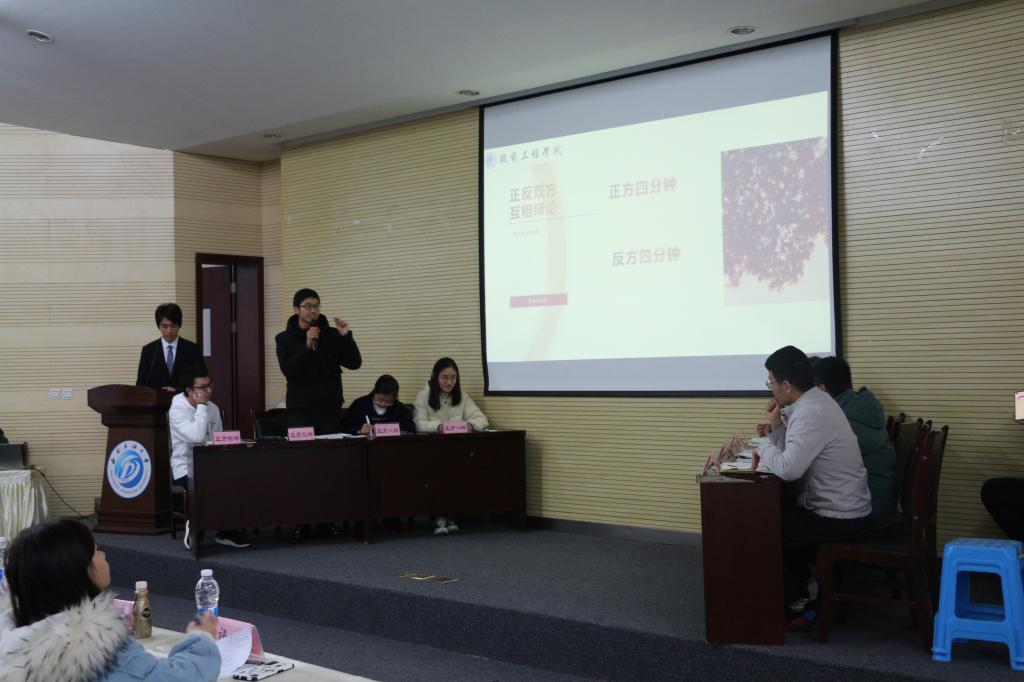 在随后的攻辩环节中,双方更是争锋相对,现场气氛迅速升温,随后大赛继续进行,进入自由辩论环节。辩手们精辟的措辞,犀利的语言,展现出咄咄逼人的气势。反方辩手也毫不示弱,还举了作品抄袭等典型的例子来论证。比赛进入总结陈词环节,正反双方辩手清晰的思路和巧妙的陈词可圈可点。接着,迟鑫宇学长对本次辩论赛做了精彩的点评,他指出了四支队伍的优点和不足,并表示对机电院辩论充满了信心。。