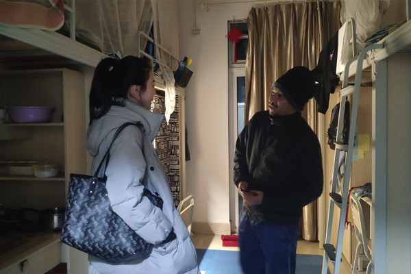 冯老师和李老师跟留学生班长了解宿舍生活情况