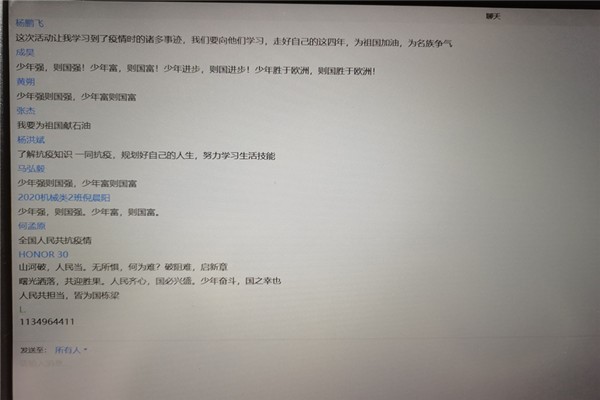 在活动的开始,由团支书连线介绍活动的流程与内容,主持人结合PPT和演讲的方式向同学们讲解本次活动的内容。同学们一起观看了《开学第一堂课》视频,一起在主持人的带领下交流问题,还一起欣赏了王仲青同学为我们带来的吉他演奏,本次活动积极的调动同学们的爱国热忱,同学们纷纷在交流区分享自己的问题和感想,最后由团支书总结了这一次团日活动的内容,同学们都很积极参与,即使是在这疫情的特殊时期,透过屏幕我们依旧能感受到同学们对社会、对祖国发展的殷切期望和热情。