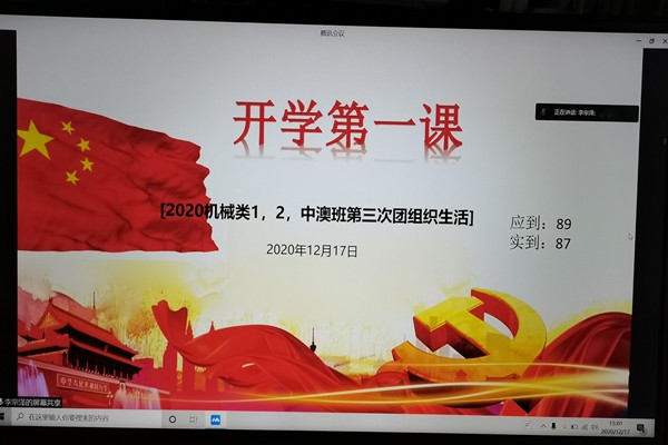 为了迎接新时代青年面临的新挑战、新征途,培养广大青年的积极向上的美德,进一步弘扬爱国、爱党、爱团精神,坚定爱国信念,激发青年们对祖国,对社会发展的热情。12月17日下午三点,机电工程学院20级机械类1、2、中澳支部迎来了12月团组织活动,本次活动主题为“开学第一课”。由于疫情原因,本次团组织生活安排在线上举行,由李宗泽同学和王仲青同学担任主持,总领活动的顺利进行。