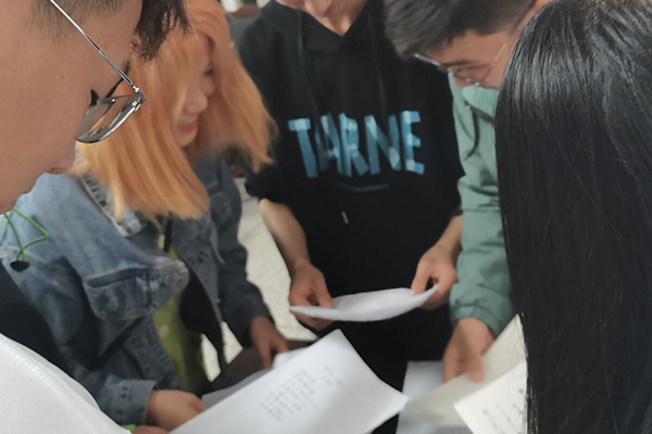 心声服务站同学和组织部同学正在进行优秀作品评选