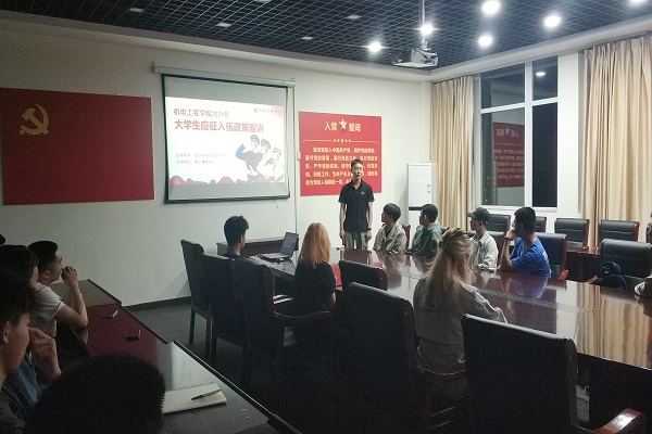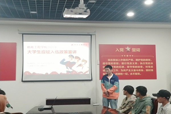 为助力信息化军队的建设,2021年4月22日晚,在明志楼B504举办了毕业生应征入伍政策宣讲会。本次宣讲会面向机电院有意向参加应征入伍的毕业班同学,旨在为同学们介绍相关政策,讲解毕业生应征入伍的优势以及发展前景等,激发同学们参军入伍的积极性。