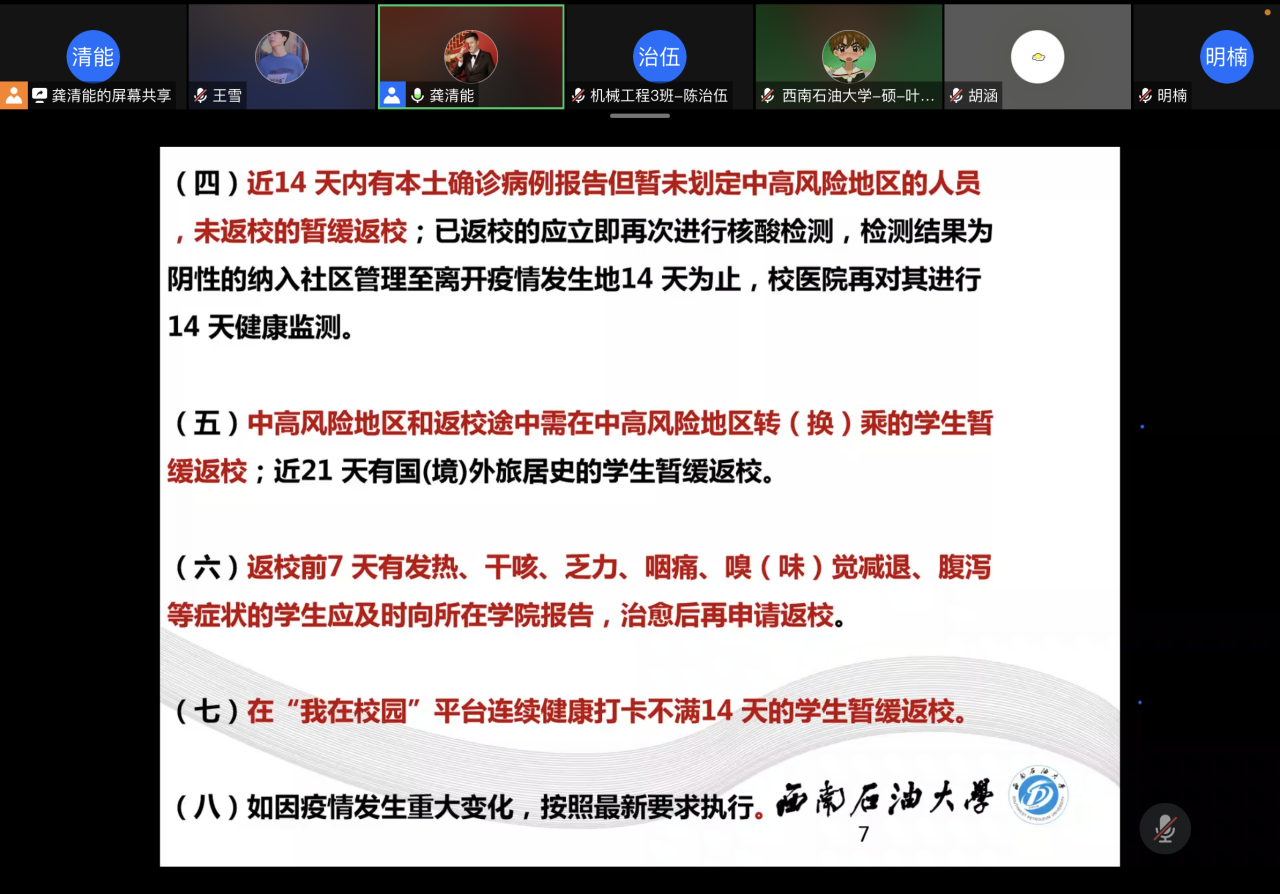 近日疫情形势严峻复杂,防控压力持续增大。为降低疫情输入传播风险,切实保障广大学生的身体健康和生命安全,有序返回校园。龚清能老师就川外和川内大学生分批返校提出具体要求,并对返校后学生生活进行相关安排和流程解答。着重强调符合返校要求并经学院审批同意的同学,应严格按照以上时间安排返校报到,不得提前返校。