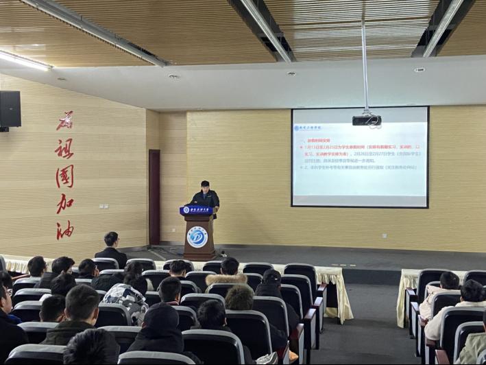 会上夏老师分别强调了以下几点:1、寒假放假时间以及期末考试安排,提醒大家注意防火防盗防诈骗,出行注意安全,遵纪守法。2、对于有特殊原因不回家或者晚回家的同学须要办理留校手续,在校遵纪守法,严禁违反相关规定;3、注意选课;4、诚信应考;5、基于寝室防火安全等。学校后勤服务总公司学生公寓管理中心将根据假期离校、留校登记情况,对寒假期间全员离校的学生寝室实行断电和贴封处理。学生因开学补考等原因提前返校的,必须在本楼门卫处登记才能恢复寝室供电。