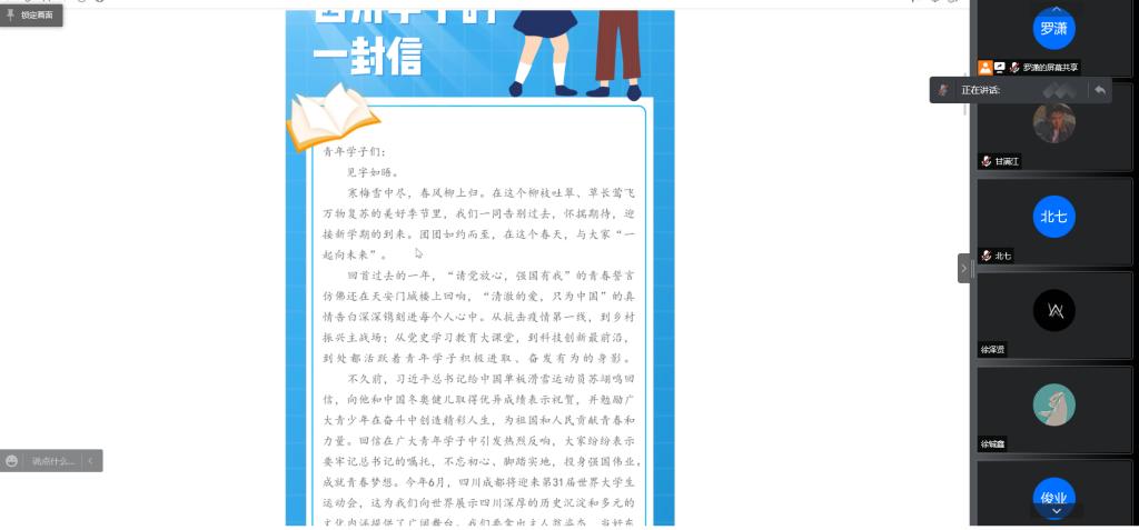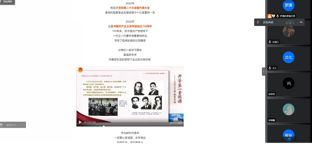 之后大家共同阅读《团团致四川学子的一封信》,信中饱含了对新青年的无限期望。观看共青团在党的领导下走过的光辉历程视频。依托视频、歌曲等形式让青年学生重温中国共产主义青年团成立100周年来的奋斗故事,新青年要以爱国、进步、民主、科学为内涵的五四精神,融入社会主义核心价值观和中华民族的血液;成为我们时代的风向标,绽放青春芳华。