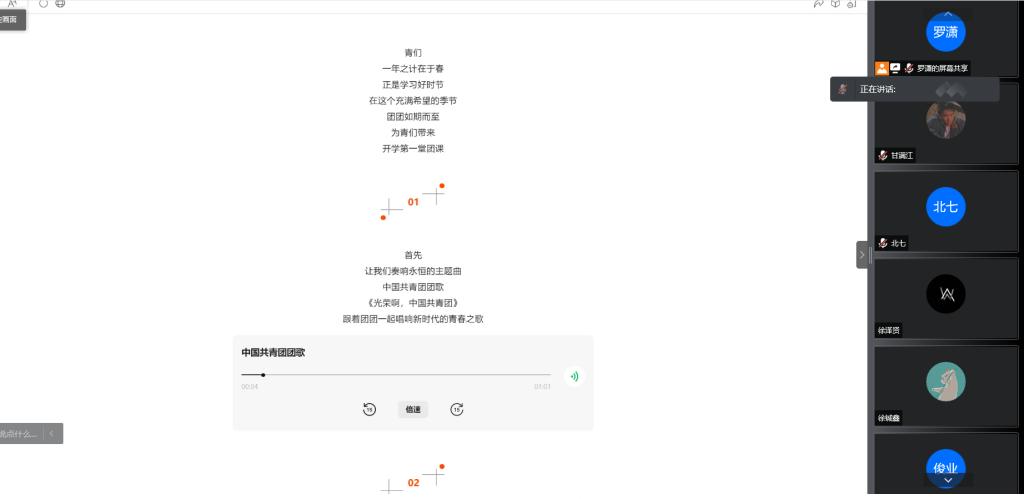 主持人罗潇首先带领全班同学合唱共青团团歌并重温了入团誓词,带领大家温习了中国共青团团歌的精神,追忆了1919年五四运动的精神,将马克思列宁主义和中国工人运动进一步结合在一起,为中国共产党的创立做好了准备。每一次团课重温团歌和入团誓词都是我们团支部的传统,目的就是希望团员们不忘共青团的初衷。