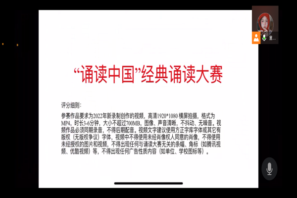 为迎接党的二十大胜利召开营造良好氛围,为开启全面建设社会主义现代化四川新征程、实现中华民族伟大复兴凝聚磅礴力量。机电院研究生会举办了“诵读中国”经典诵读大赛,于2022年5月20日晚上通过线上腾讯会议对收集的21份作品进行评选。此次活动评审团由机电院研究生会主席、传媒部负责人组成。