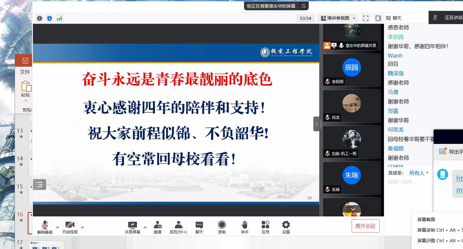 正值2022年毕业季,为进一步落实学校2022届毕业生离校的工作,帮助我院毕业生文明诚信离校,激发广大机电学子爱校荣校,感恩母校、感恩师长,学院认真制定文明离校教育方案,在5月25日晚于线上举行2022届毕业生离校教育工作会,本次会议由学院团委书记、毕业班辅导员章志华老师主持,全体2022届本科毕业生参加。