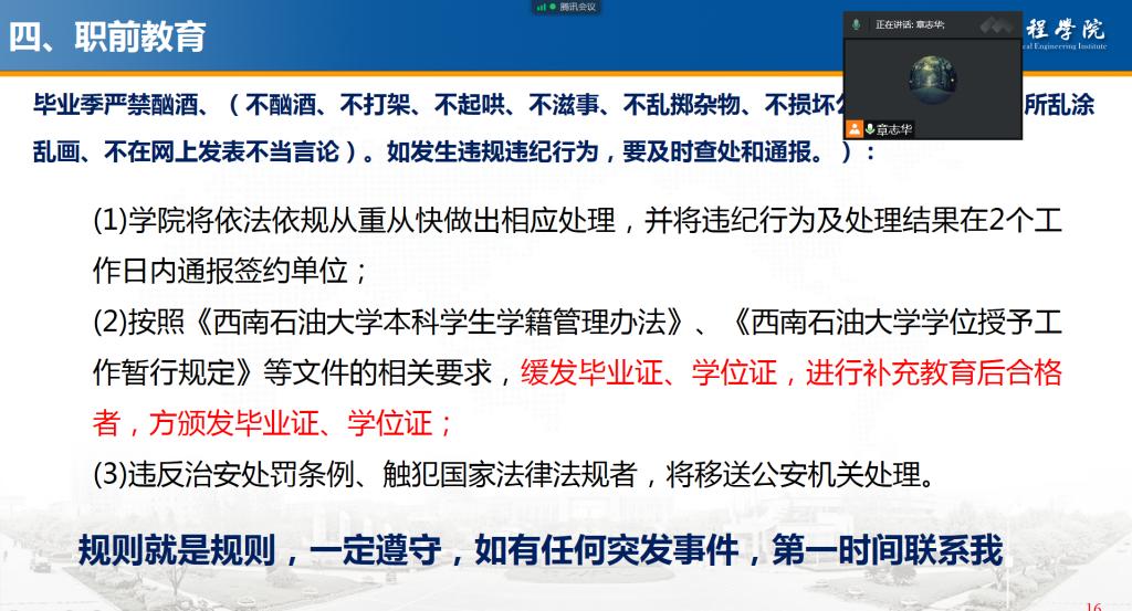 随后,章志华老师说明毕业前日常管理要求:一是加强疫情防控管理。二是加强离校安全教育,要提醒毕业生不参加可能危及人身安全的活动,不涉足有碍身心健康的场所。三是引导学生自觉做到“八个不”(不酗酒、不打架、不起哄、不滋事、不乱掷杂物、不损坏公物、不在公共场所乱涂乱画、不在网上发表不当言论),做好文明离校。四是加强诚信感恩教育。引导各位同学珍惜最后的学生时光,永远满怀对父母、对恩师、对朋友的感激之情,关爱自己。