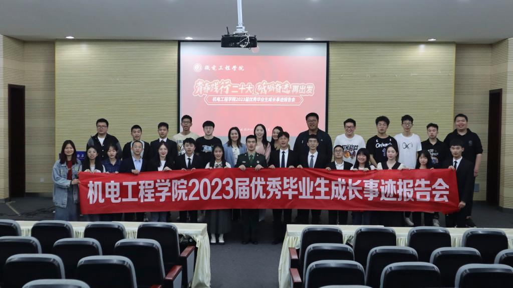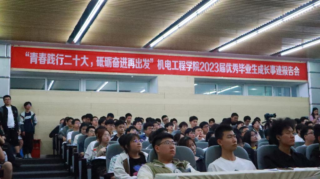 为深入学习贯彻党的二十大精神,更好地展现我院2023届优秀毕业生的风采。4月27日19点,机电工程学院于明志楼B105学术报告厅举办了“青春践行二十大,砥砺奋进再出发”2023届优秀毕业生成长事迹报告会。9名优秀毕业生代表分享了他们的青春奋进故事。毕业班辅导员袁玥、龚清能、谭翔、魏文和学院低年级200余名参加此次报告会。