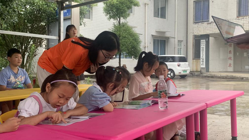 约八点半,轸溪镇悦读书屋突然停电。由于书屋内光线不足,实践队队员带着小朋友们转移战场,将课堂从室内搬到了室外。半晌,室外下起了实践队到达轸溪镇之后的第一场雨。