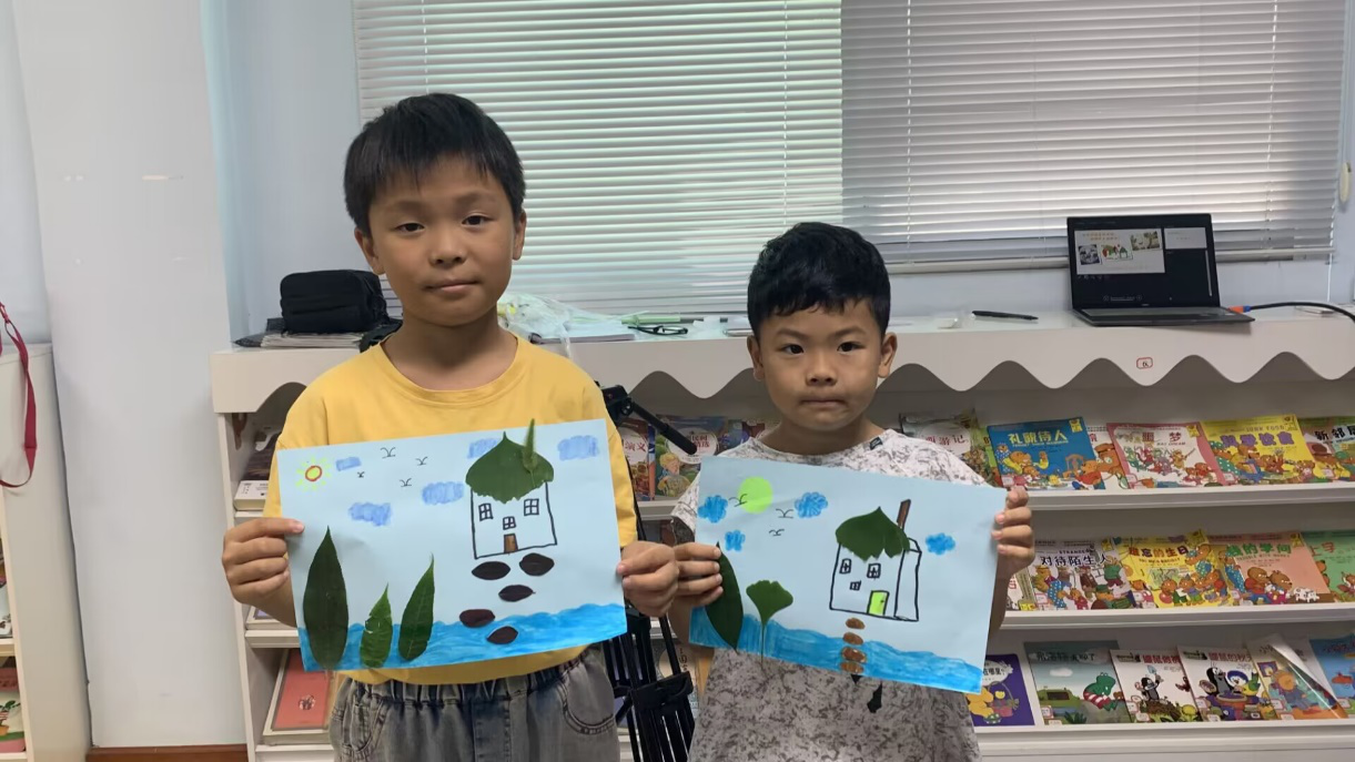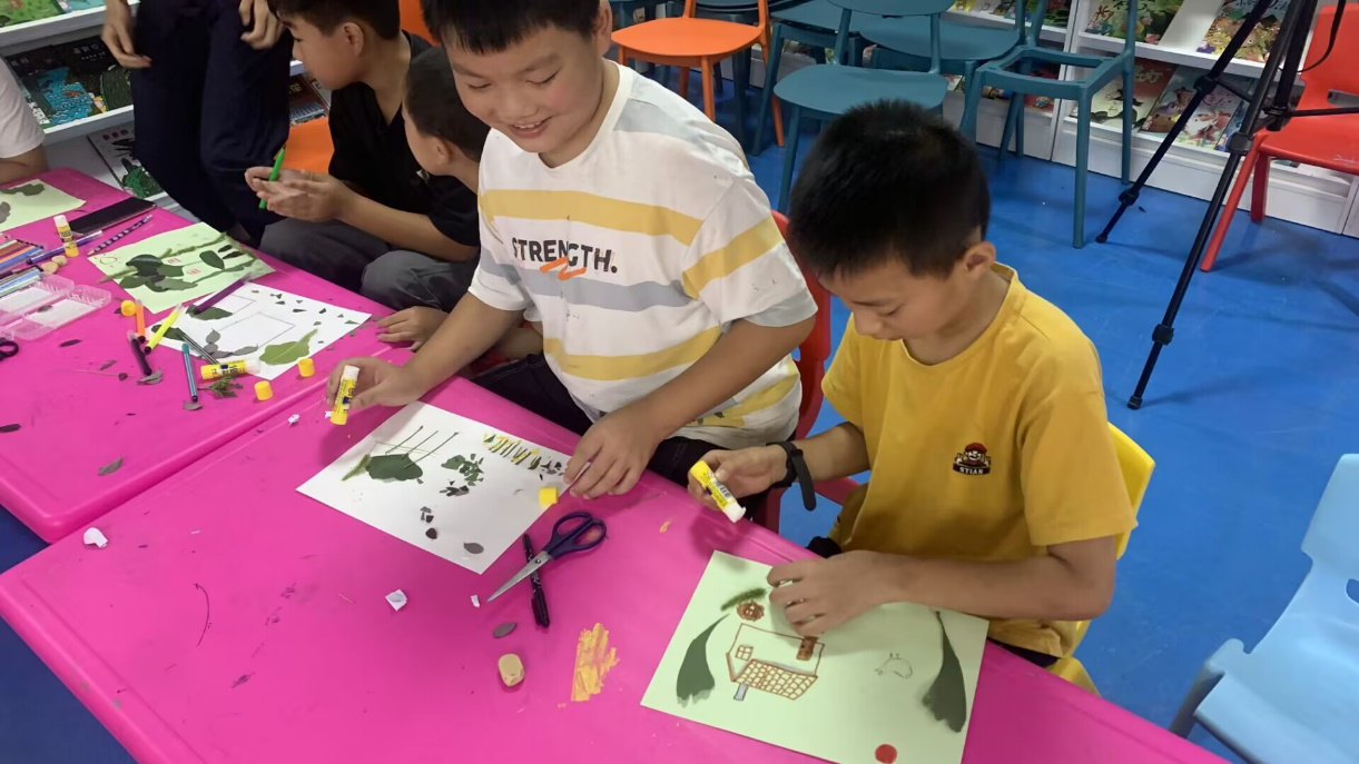 第二堂课,队员们组织孩子们利用采摘的各种各样的树叶制作树叶贴画,贴出自己心目中的家乡。这堂手工课不仅锻炼了孩子们的动手能力,更培养了他们对于自己家乡的热爱,加深了他们对于家乡的了解。孩子们的树叶贴画童趣盎然,他们以自己稚嫩的双手剪贴出温馨的家乡。