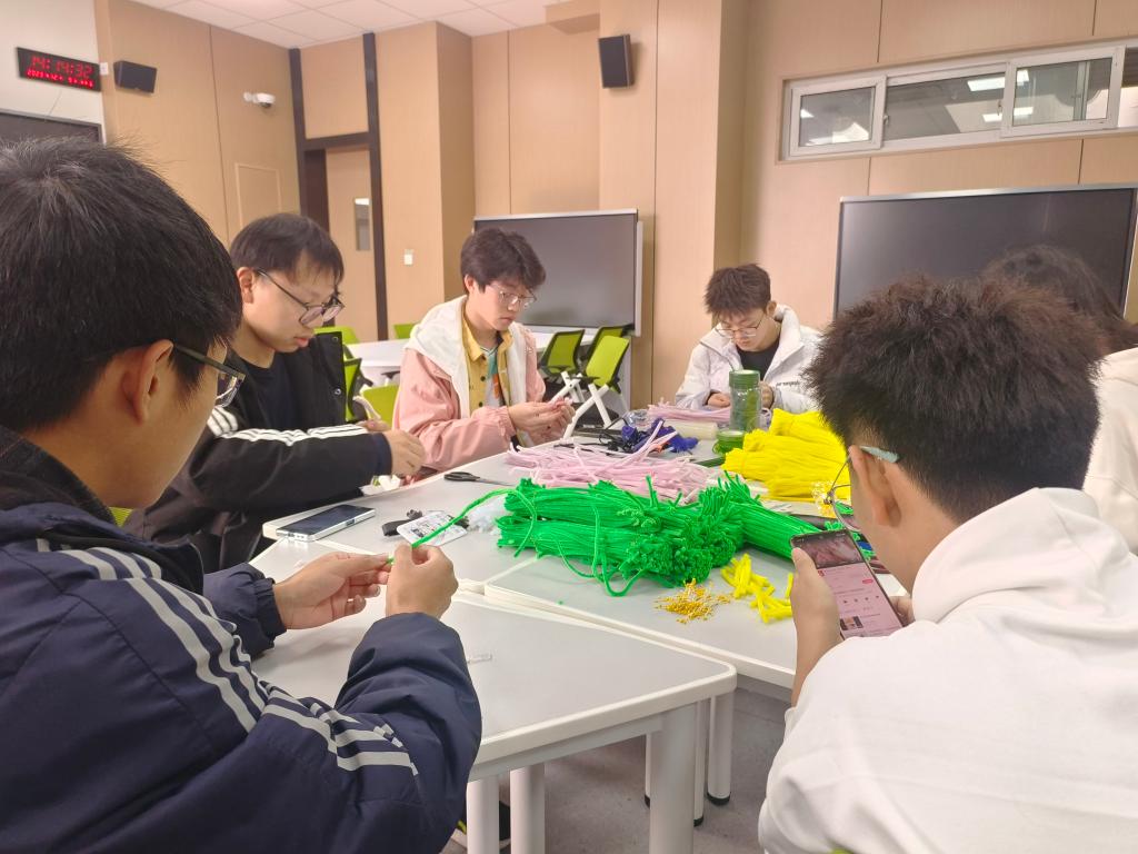 活动当天,组织部为大家准备了各种颜色的扭扭棒、丝带、弹力绳、热熔枪等材料。在观看了教学视频后,同学们开始认真地制作绒花。他们先将绒棒剪成三种长度不一短绒棒,接着把它们一个个折起来折成花瓣,然后用弹力绳将花瓣一片片固定在花枝上,最后做出枝叶,让花瓣“盛开”,一朵栩栩如生的绒花就完成了。虽然制作过程有些繁琐,但同学们都表现出了极大的热情和耐心,纷纷表示这是一次难忘的体验。