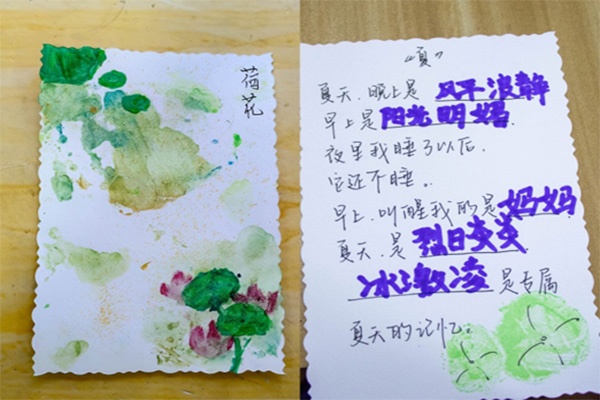 随着讲解的结束,小朋友们纷纷先挑选自己所喜爱颜色的颜料制作染卡,再以填词的形式拿起笔,让思绪随着夏日的微风自由翱翔。有的小朋友以“夏日蝉鸣”为题,填出“绿荫深处蝉声急,夏日炎炎意难平”,生动描绘了夏日午后的宁静与蝉鸣的喧嚣;有的则以“荷塘月色”为灵感,创作出“荷花仙子凌波舞,蛙声一片伴歌声”,将荷塘的柔美与月色的宁静完美融合。