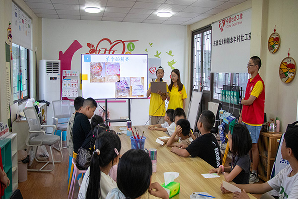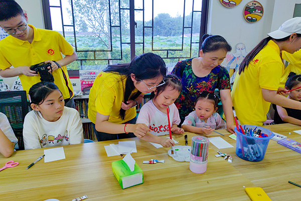 图为“诗韵乡行”实践队队员为小朋友解答疑惑