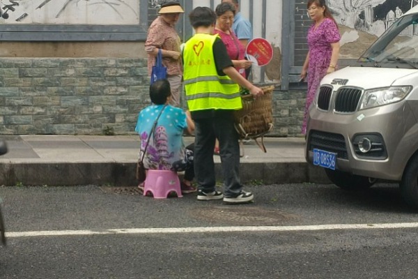 队员帮老人把菜提到菜市场